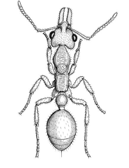 I created 14 scientific illustrations of ants for a book by renowned biologist E.O. Wilson. I referenced preserved ant specimens under 150x magnification and created the illustrations by hand using micron pens on bristol.